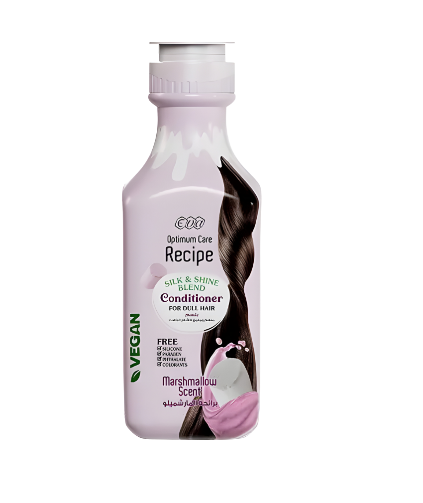بلسم Eva Recipe Silk & Shine Blend – Marshmallow Scent (350 مل) مصمم خصيصًا للشعر الباهت والمجعد ليمنحه ترطيبًا فائقًا ولمعانًا طبيعيًا من الجذور حتى الأطراف.