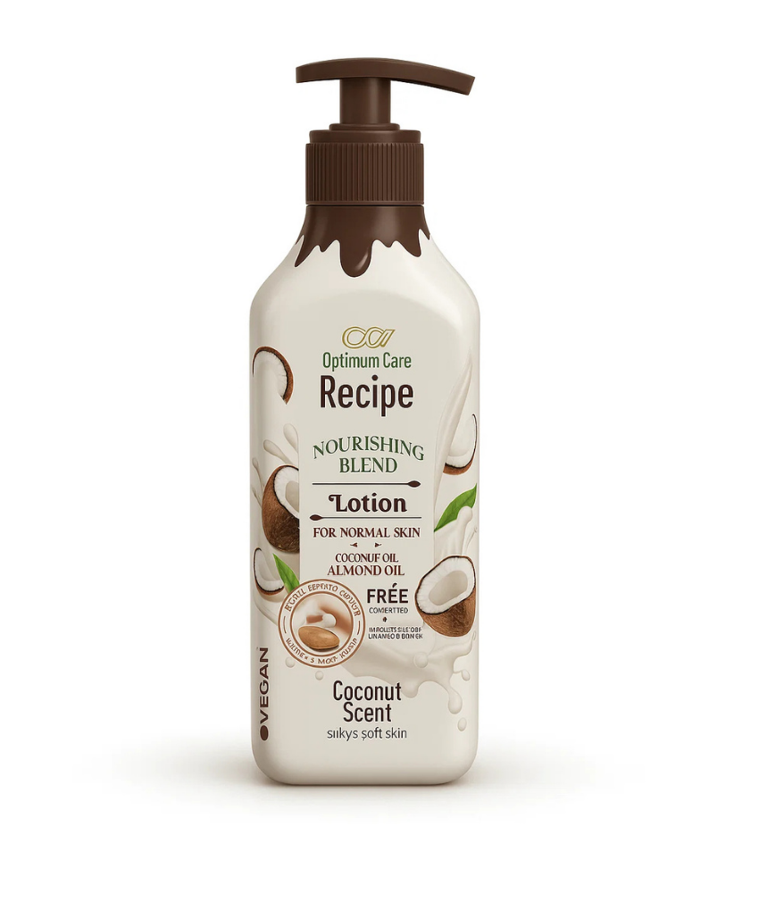 لوشن Eva Recipe Nourishing Blend – Coconut Scent (370 مل) تم تصميمه خصيصًا لتغذية البشرة العادية ومنحها نعومة فائقة بفضل تركيبته الغنية بزيت جوز الهند وزيت اللوز الطبيعي.
